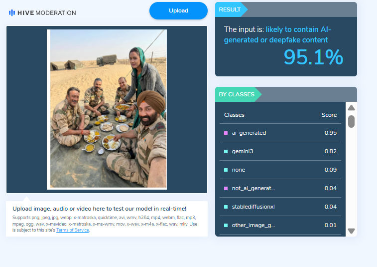 To verify the claim, we first checked Google for the official star cast of the film Border 2. Our search showed that the names of the actors seen in the viral image are not part of the film’s officially announced cast. Next, upon closely examining the image, we noticed that the facial structure and expressions of the actors appeared unnatural and distorted. The facial features did not look realistic, raising suspicion that the image might have been created using Artificial Intelligence (AI). We then scanned the viral image using the AI-generated content detection tool HIVE Moderation. The results indicated that the image is 95 per cent AI-generated.