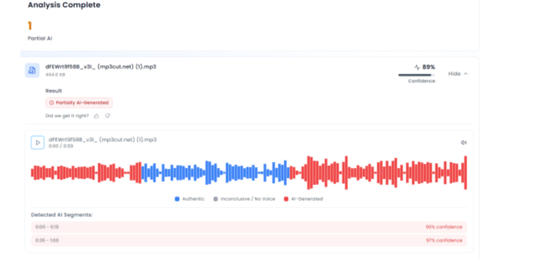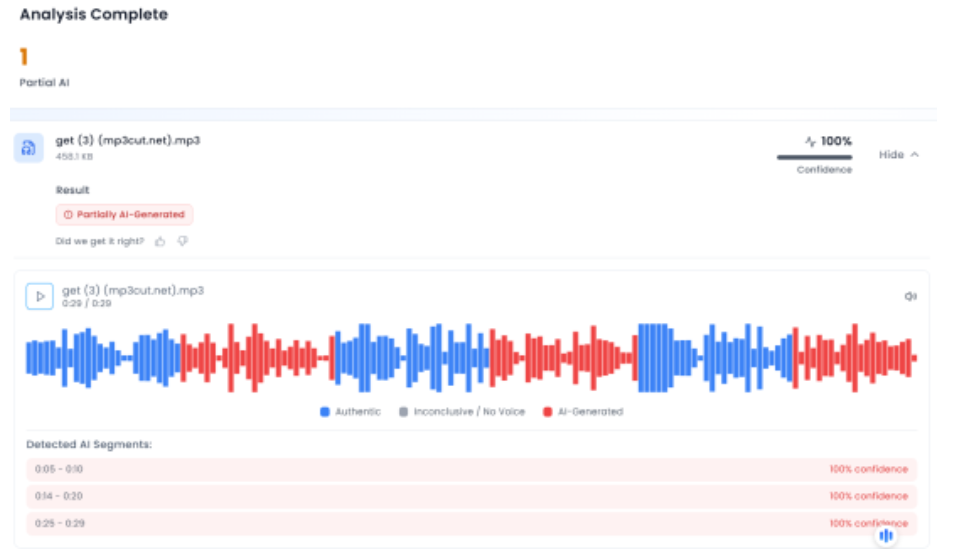 In the next stage of the research , the audio track from the viral video was extracted and analysed using the AI voice detection tool Aurigin. This confirmed that the original visuals were misused and overlaid with a synthetic voice track to create a misleading narrative.