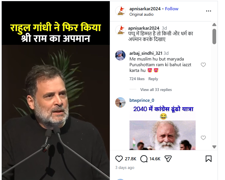 On January 22, 2026, an Instagram user apnisarkar2024 shared the video claiming, “Rahul Gandhi once again insulted Shri Ram.” (Link, archive link, and screenshot available above)