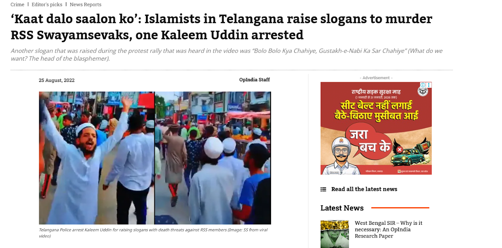 Further verification led the team to a report published by news portal OpIndia on August 25, 2022, which featured identical visuals from the viral clip. According to the report, the video showed a protest march organised against BJP MLA T. Raja Singh following his alleged controversial remarks about Prophet Muhammad. The report identified one of the individuals in the video as Kaleem Uddin, who was allegedly heard raising the slogan “Kaat daalo saalon ko,” to which the crowd responded “RSS walon ko.” The slogan was linked to incitement against RSS members.
