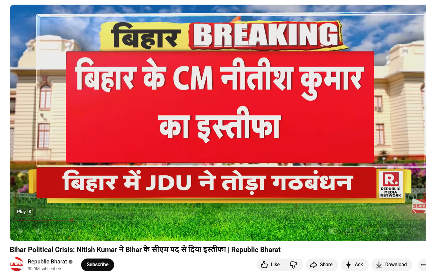 An Instagram user shared a video on January 26 claiming that Bihar Chief Minister Nitish Kumar had resigned. The post further alleged that the news was first aired on Republic channel and that Kumar had submitted his resignation to then-Governor Phagu Chauhan. The link to the post, its archived version, and screenshots can be seen below. (Links as provided)