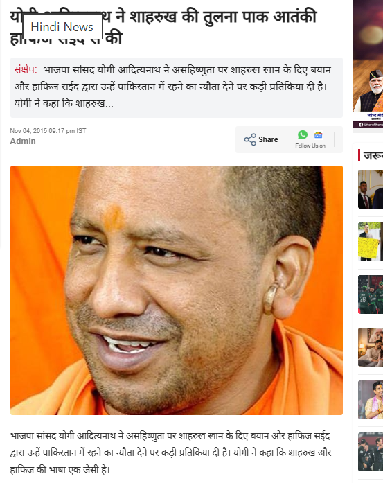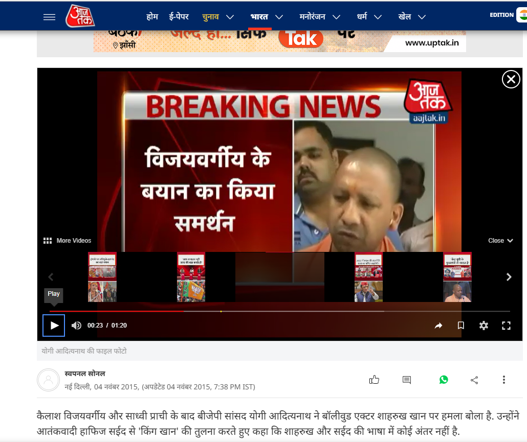 Further research traced the video to Aaj Tak’s website, which reported on November 4, 2015, that then-BJP MP Yogi Adityanath criticized Shah Rukh Khan, comparing his language to that of terrorist Hafiz Saeed, stating that there was no difference in their statements.