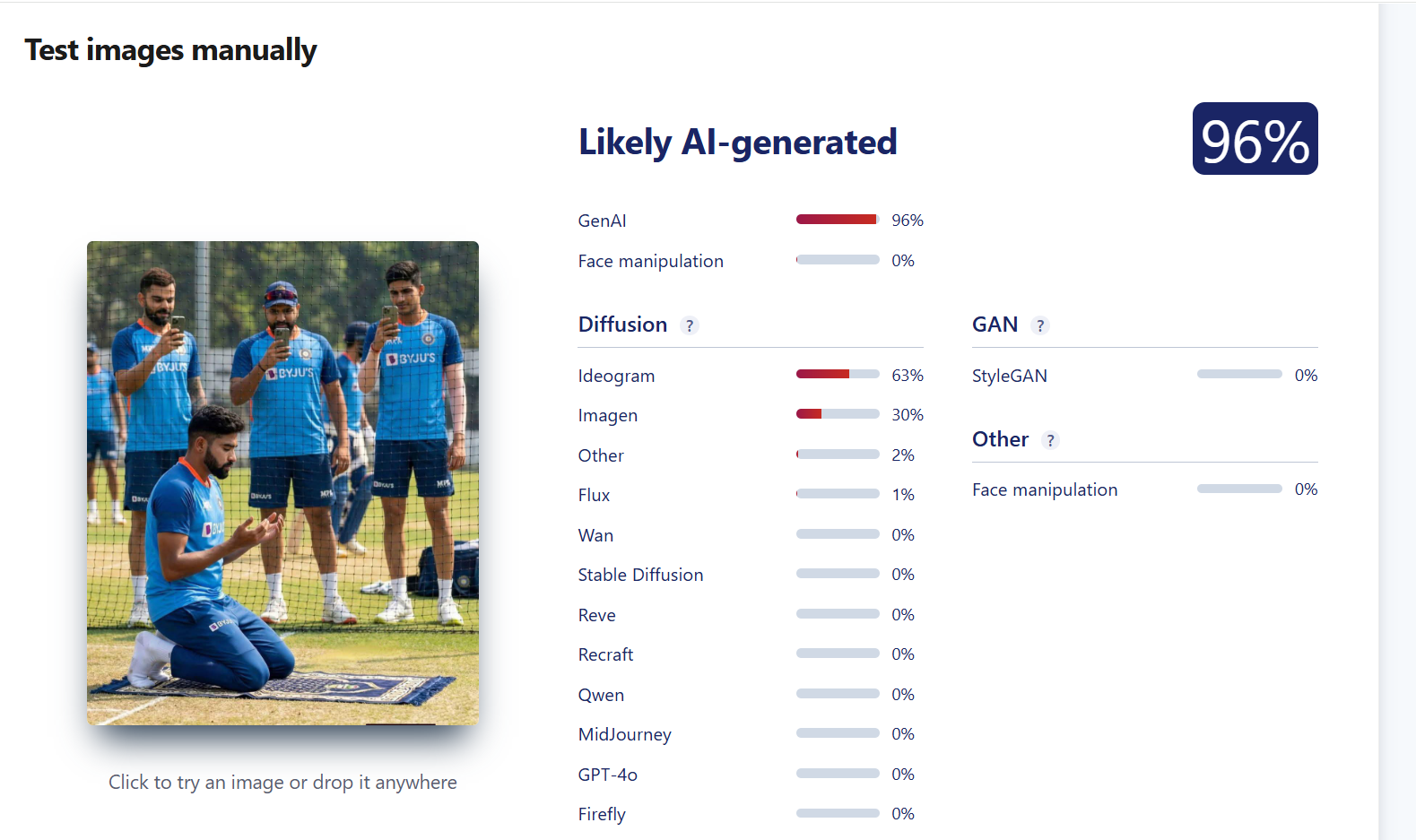To further strengthen the verification, the image was also scanned using another AI detection platform, Sightengine. The results indicated a 96% probability that the image was generated using artificial intelligence.