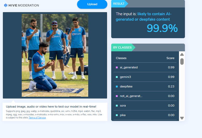 On closely examining the viral image, several visual inconsistencies and unnatural elements were observed, raising suspicion that the picture may not be authentic.To verify this, the Cyber Peace Foundation analysed the image using the AI detection tool Hive Moderation. According to the tool’s assessment, the image showed a 99% likelihood of being AI-generated.