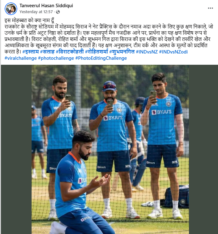On January 14, 2026, multiple Facebook users shared the viral image with captions describing it as a touching scene from Rajkot’s Saurashtra Stadium. The posts claim that Mohammed Siraj took time out during net practice to offer prayers, reflecting his strong faith, while fellow cricketers Rohit Sharma, Virat Kohli and Shubman Gill respectfully captured the moment on camera.