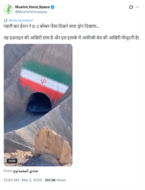 X user “Muslim_Voice_Space” posted the video on March 3, 2026, claiming that Iran had rolled out a drone resembling the B-2 bomber for use in the war.