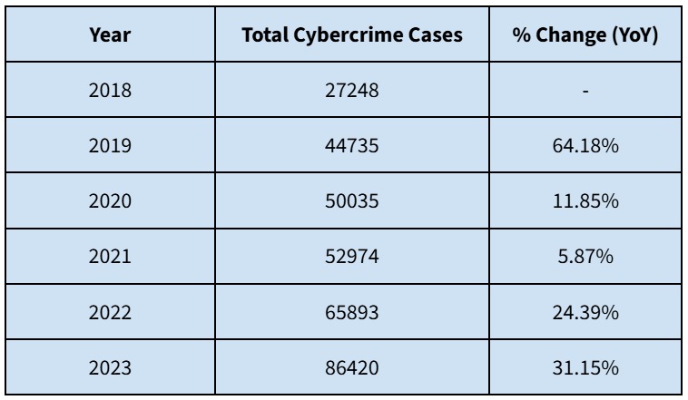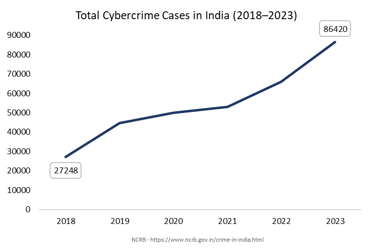 The data published by the NCRB represent the number of crimes that reached the point of the First Information Report (FIR) registration, meaning they reflect only cybercrime cases that were formally presented to the law enforcement system to investigate, rather than all complaints reported. The data shows that cybercrime cases increased from 27,248 in 2018 to 86,420 in 2023, a 3.17-fold increase in 5 years.
