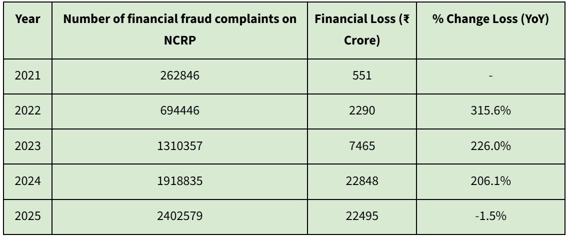 The financial losses reported between 2021 and 2024 increased by 41 times over four years, compared to 2021, from 551 crore to 22,848 crore. At the same time, the number of complaints rose from 262,846 to over 1.9 million, an increase of ~623%, indicating both rising victimisation and greater public awareness of reporting mechanisms.