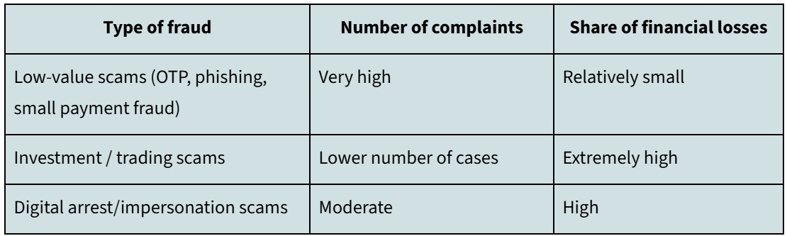 3. Complaint volumes and financial damage follow different patterns: When comparing complaints and financial losses, it is evident that cyber fraud losses are unevenly distributed across types of incidents. Most of the prevalent scams reported, including phishing or OTP fraud, involve relatively small transaction values but yield a high portion of complaints. Conversely, fewer categories of fraud, especially investment-based schemes, contribute a significantly higher percentage of total financial losses.