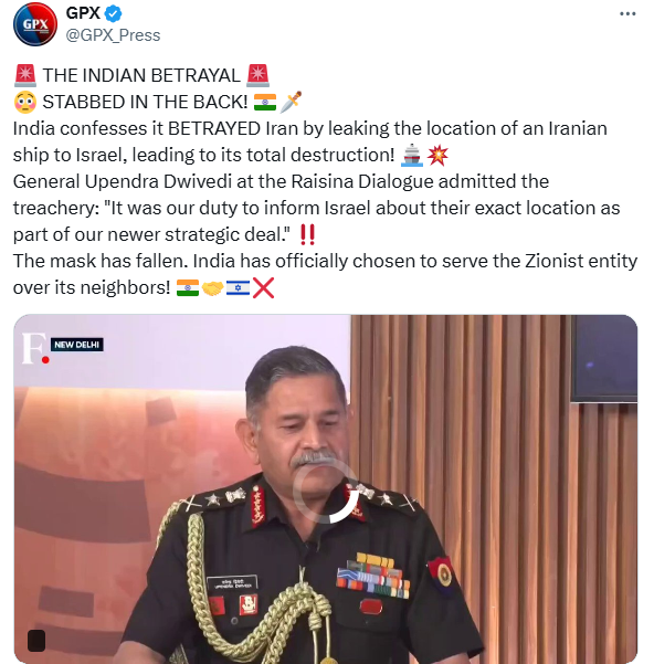 A 57-second video featuring India’s Chief of Army Staff Upendra Dwivedi is widely circulating on social media. The clip is being shared with the claim that the Army chief admitted India had “betrayed” Iran by providing the location of an Iranian naval ship to Israel, allegedly leading to its destruction The video is spreading amid heightened tensions in West Asia involving United States, Israel, and Iran. According to posts sharing the claim, the Iranian naval vessel IRIS Dena, which had participated in a naval event in Visakhapatnam and was returning to Iran with around 130 personnel onboard, was torpedoed by a US submarine near the southern coast of Sri Lanka on March 4 while sailing in the Indian Ocean.