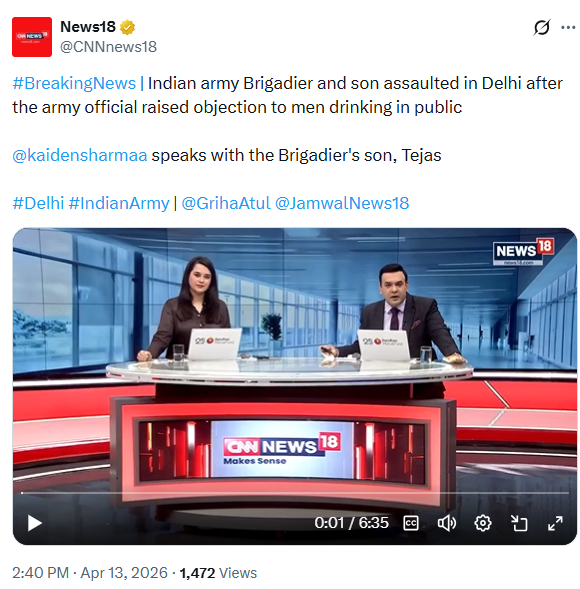 An X user (@Mohammad776157) shared a video clip from Network18 on April 13, claiming that a serving Indian Army brigadier and his son were attacked in Delhi by an RSS-supporting mob for criticising the government over “Operation Sindoor.”